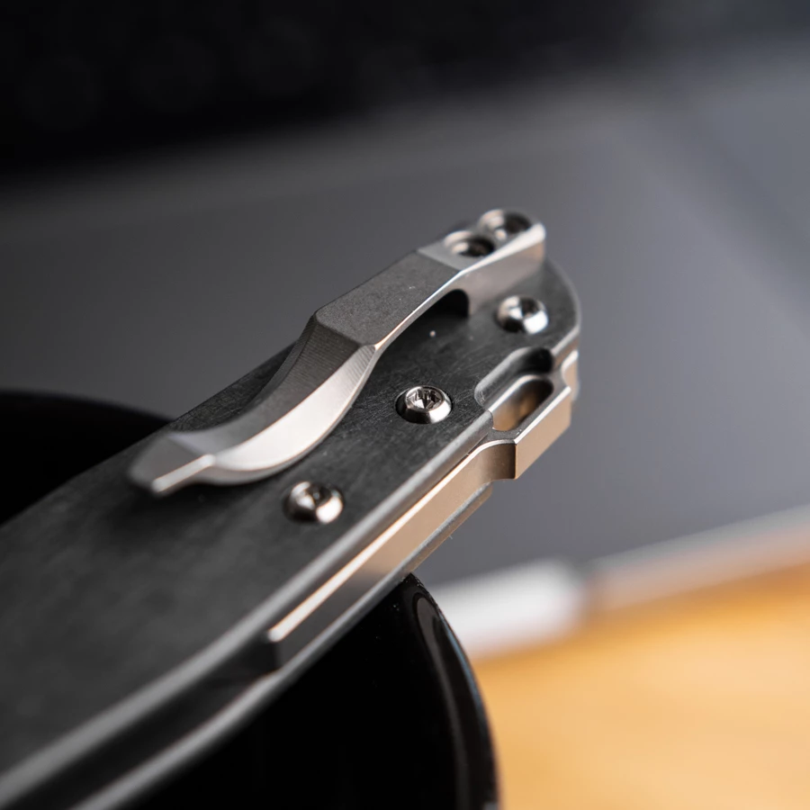 The zirconium handle scales offer an exciting surface that also feels great thanks to the brushed finish. The backspacer as well as the clip are made of gray titanium.