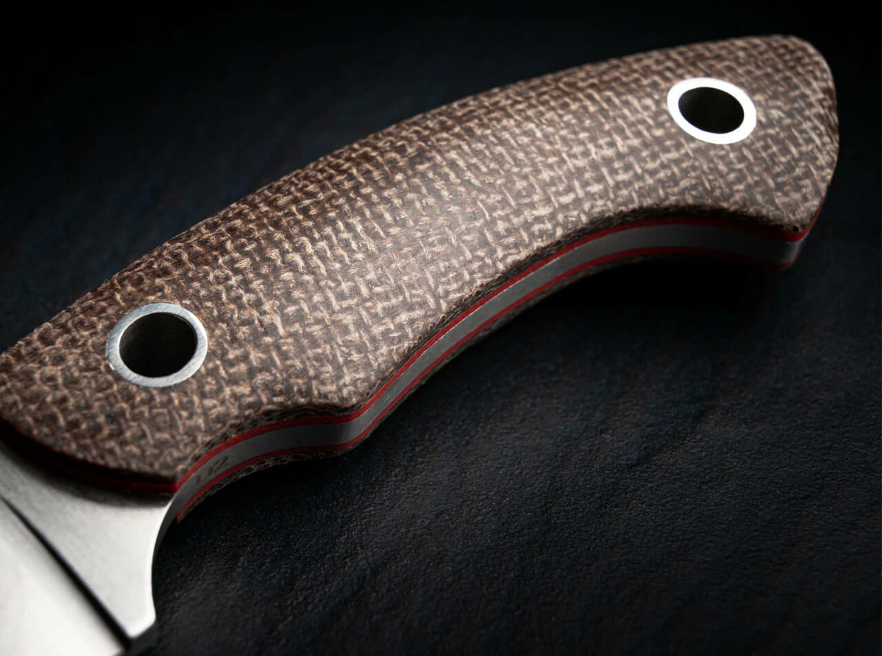 This full tang knife is made of solid D2 steel, which is considered to be extremely tough, durable and keeps the cutting edge sharp for a long time. Following the tradition of the classic Nessmuk knives, the blade has the typical upward sweep and a slight hump on the back of the blade towards the tip. This serves to make the tip of the knife a little easier to guide during hunting applications.