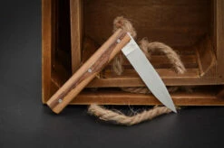 The HoneyBee is the big brother of the Spyderco Bug. The flat ground 3Cr blade is held open by the force of the spring alone without a lock.